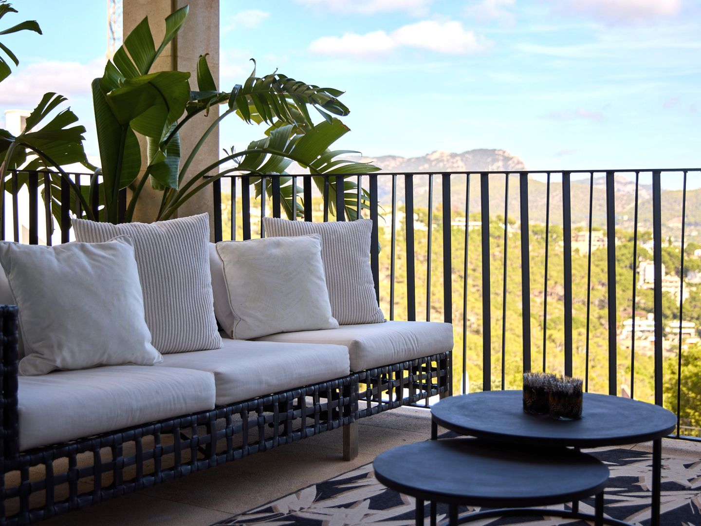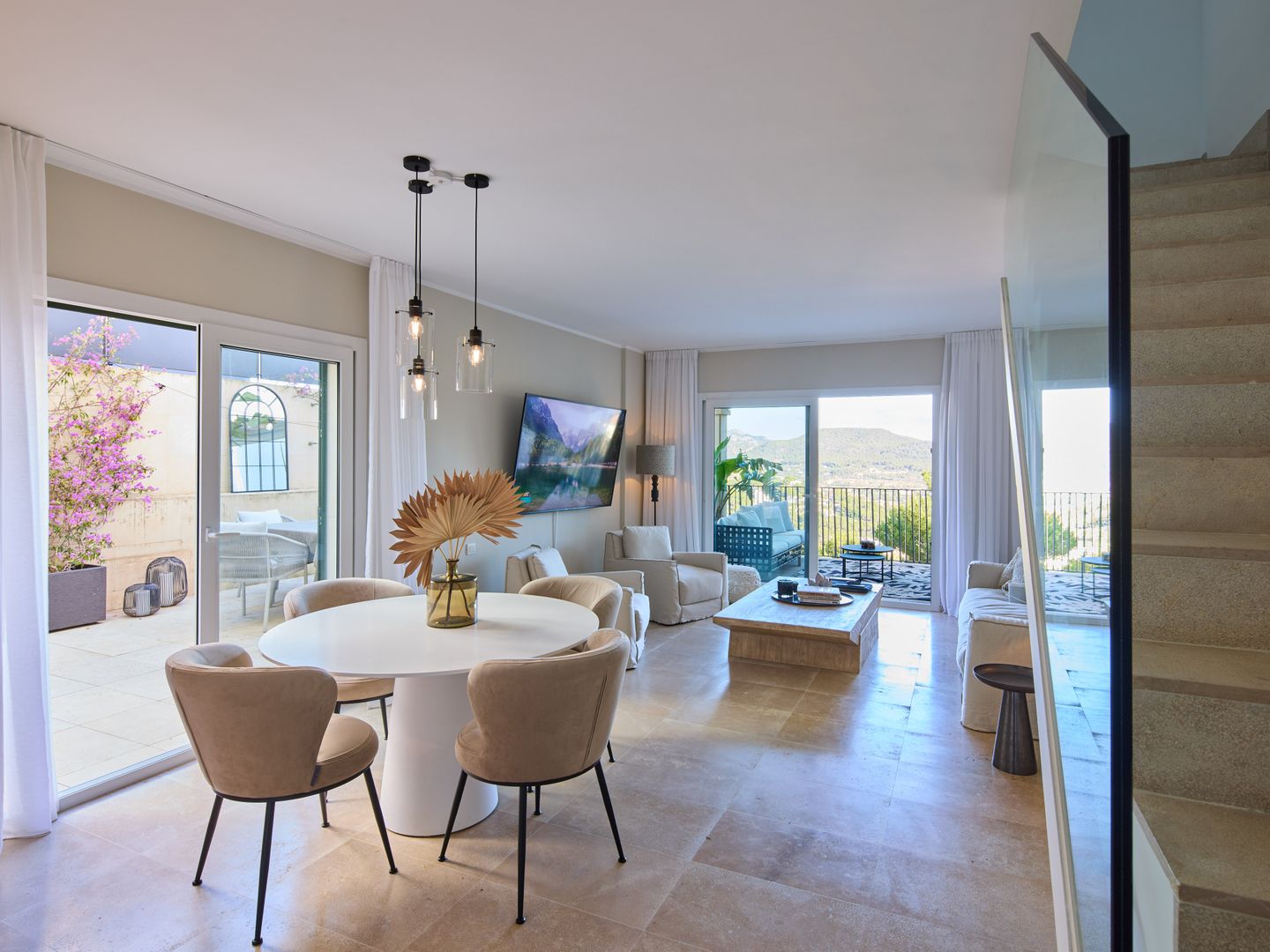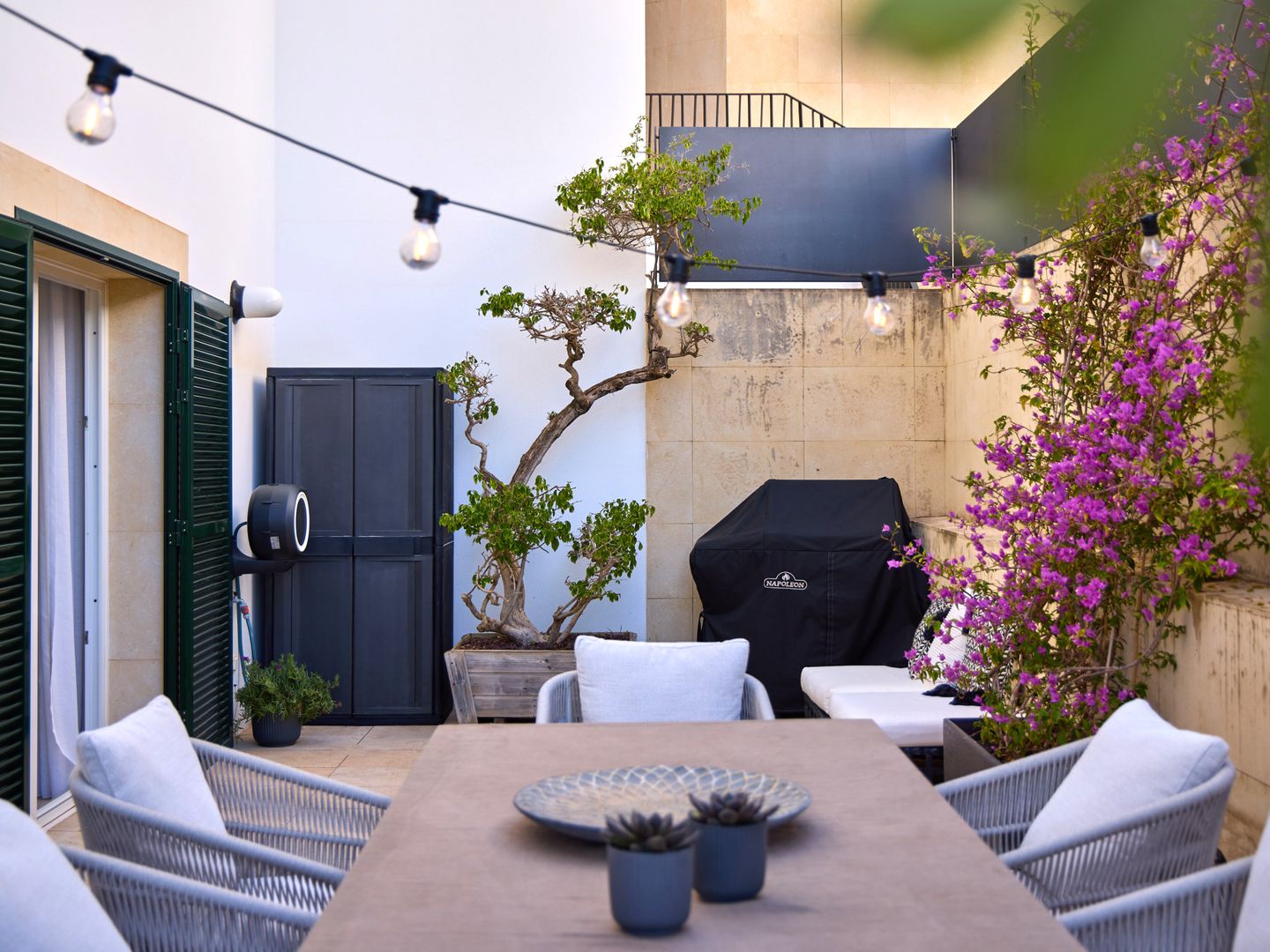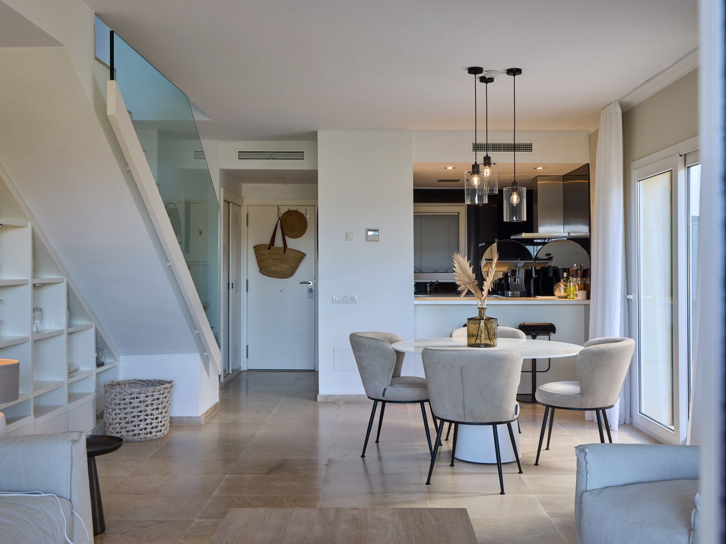 Im Erdgeschoss liegt der Wohnbereich mit offener, moderner Küche. Der Raum ist stilvoll mit einem hochwertigen Sofa und Sesseln von Gervasoni eingerichtet und verbindet Komfort mit mediterraner Atmosphäre. Vom Wohnbereich aus gelangt man auf einen Balkon sowie in den großzügigen Patio von weiteren 30 m², ausgestattet mit einer hochwertigen Essgruppe und einem Napoleon-Grill – ideal zum Entspannen und Essen im Freien.