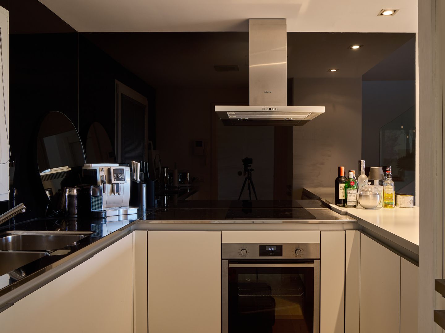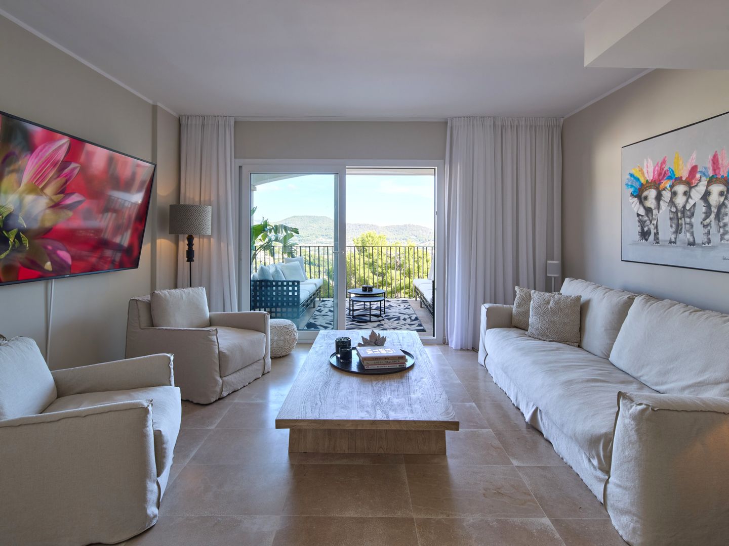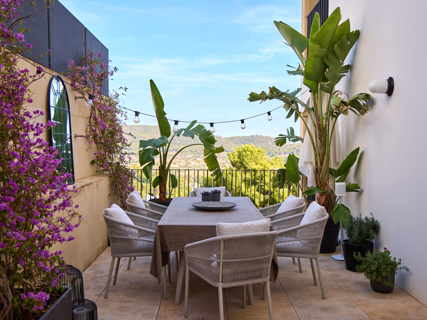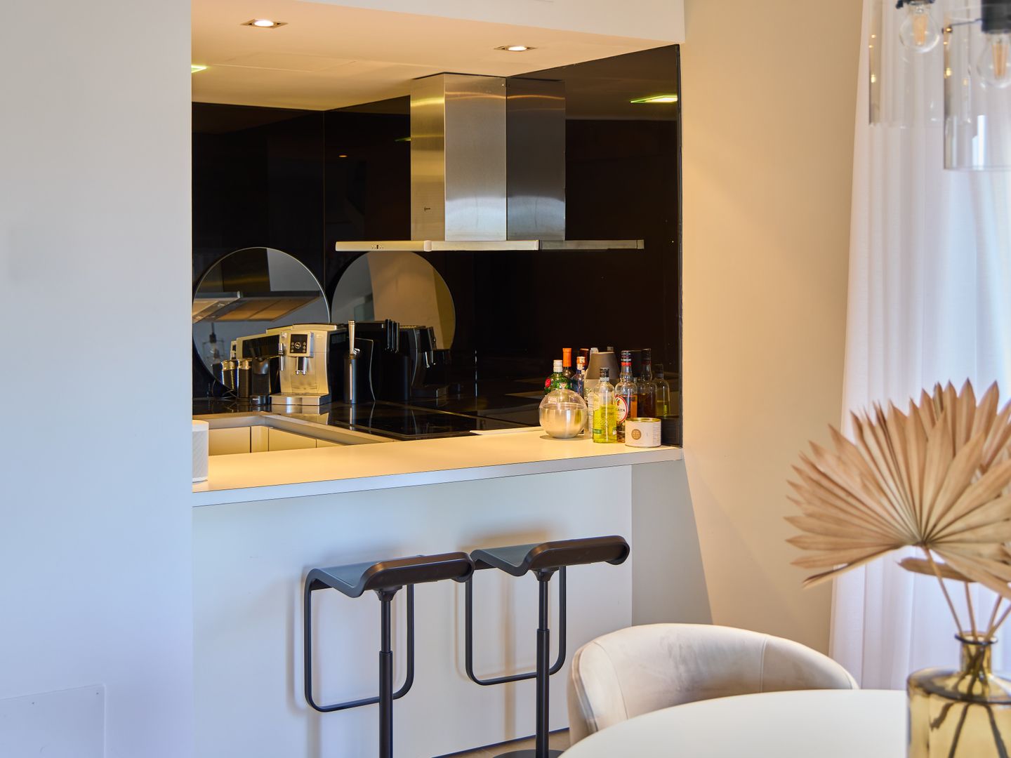 Im Erdgeschoss liegt der Wohnbereich mit offener, moderner Küche. Der Raum ist stilvoll mit einem hochwertigen Sofa und Sesseln von Gervasoni eingerichtet und verbindet Komfort mit mediterraner Atmosphäre. Vom Wohnbereich aus gelangt man auf einen Balkon sowie in den großzügigen Patio von weiteren 30 m², ausgestattet mit einer hochwertigen Essgruppe und einem Napoleon-Grill – ideal zum Entspannen und Essen im Freien.