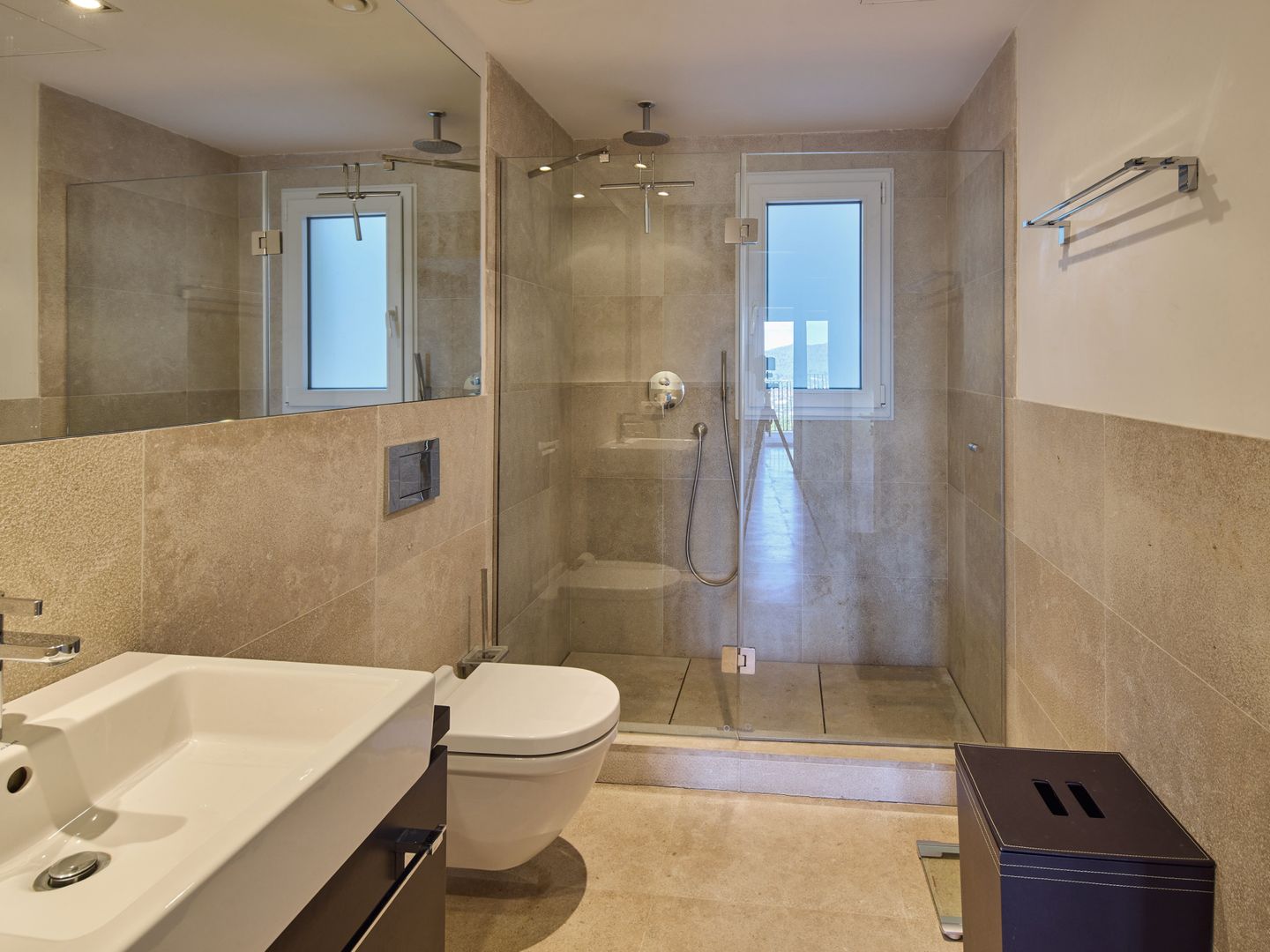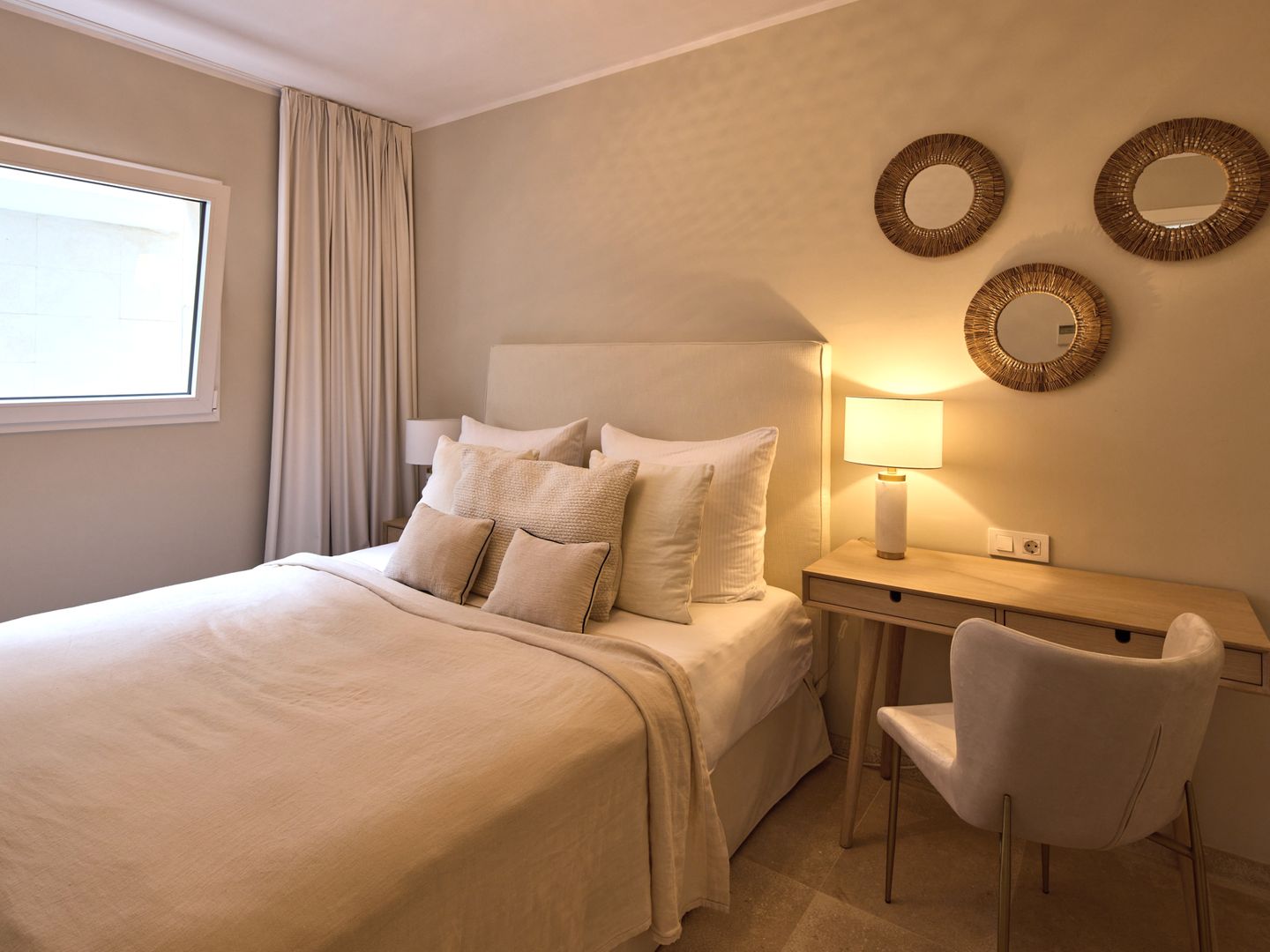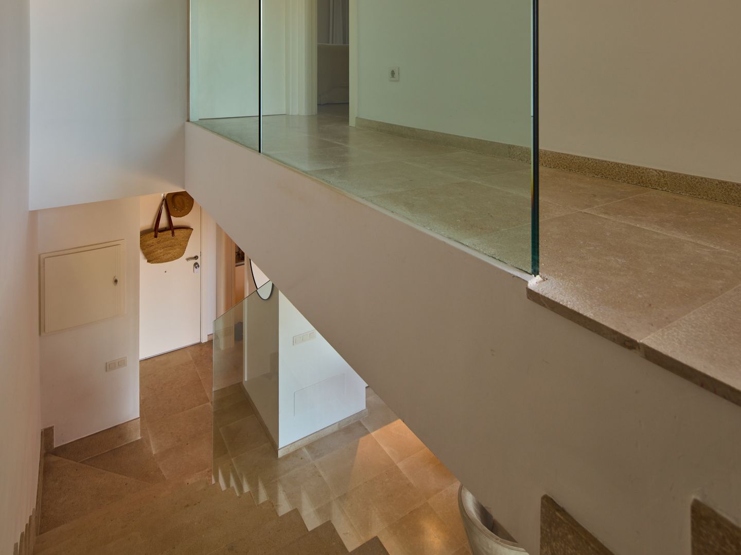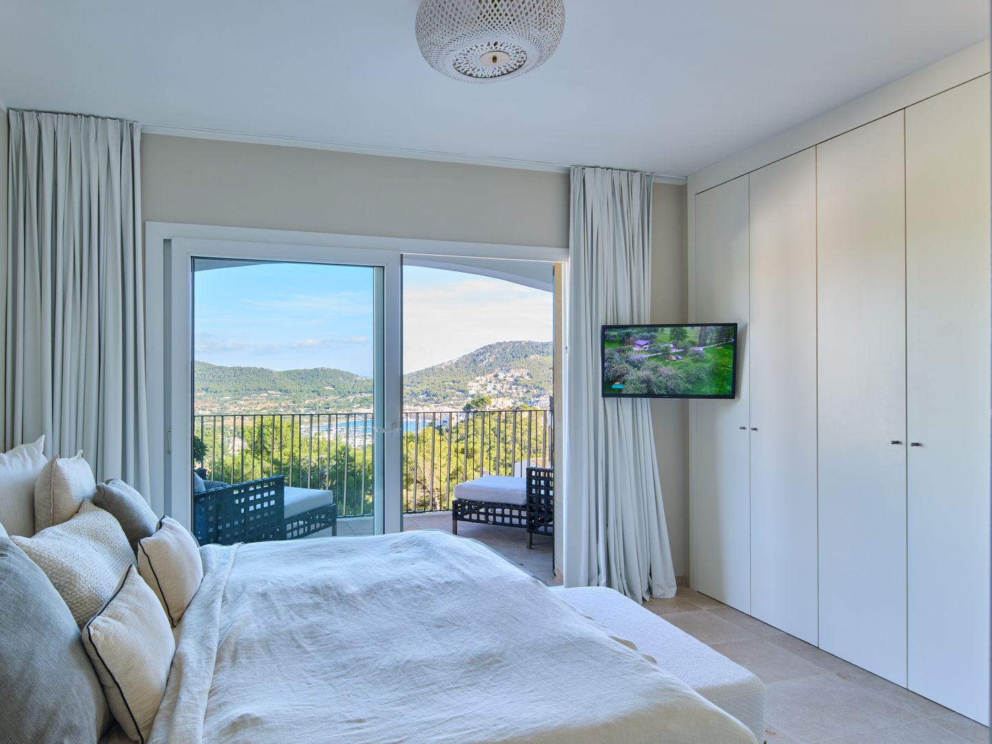 Im Obergeschoss befinden sich zwei Schlafzimmer. Das Hauptschlafzimmer verfügt über ein Boxspringbett, einen eigenen Balkon mit besonders schönem Blick auf den Hafen von Port Andratx sowie ein Bad en suite mit Dusche und Badewanne. Das zweite, kleinere Schlafzimmer ist mit einem weiteren Doppelbett und einem Einbauschrank ausgestattet. Daneben liegt ein weiteres Bad mit großer, ebenerdiger Dusche. Beide Schlafzimmer sind mit verdunkelbaren Gardinen ausgestattet und bieten so angenehme Ruhe und Komfort auch in den Sommermonaten.