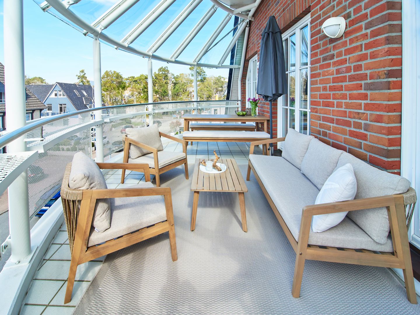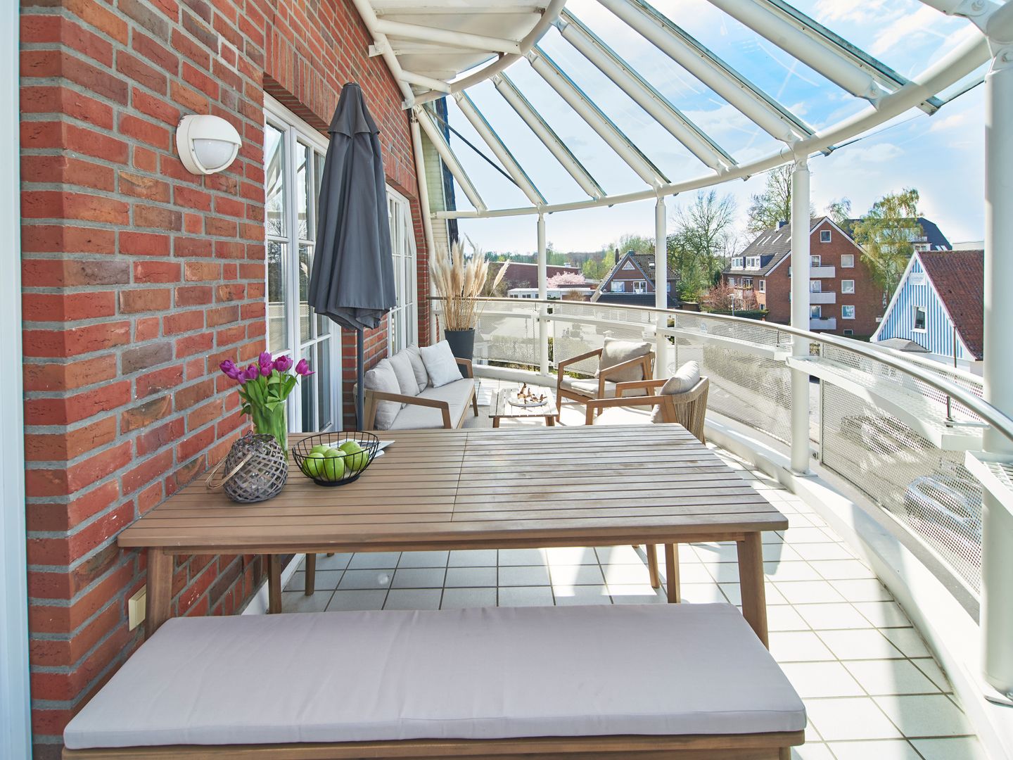 Im unteren Bereich erwarten Sie ein heller Wohnraum mit cremefarbenem Sofa, Ledersessel und Smart-TV sowie eine moderne Wohnküche mit Essgruppe und hochwertiger Ausstattung. Der kürzlich neu gestaltete, glasüberdachte Balkon ergänzt diesen Bereich mit einer gemütlichen Lounge und einem großzügigen Essplatz mit Bänken. Hier genießen Sie die Nachmittags- und Abendsonne in entspannter Atmosphäre.