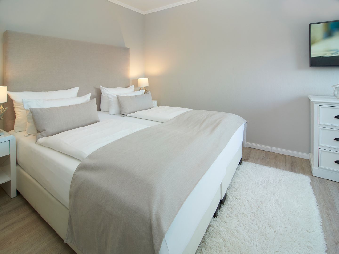 Auf dieser Ebene befinden sich außerdem zwei Schlafzimmer: eines mit komfortablem Boxspringbett und Smart-TV, das andere mit einem schmalen Doppelbett in hellen, freundlichen Tönen. Ein modernes Duschbad mit Fenster und Handtuchheizkörper ergänzt das Raumangebot.