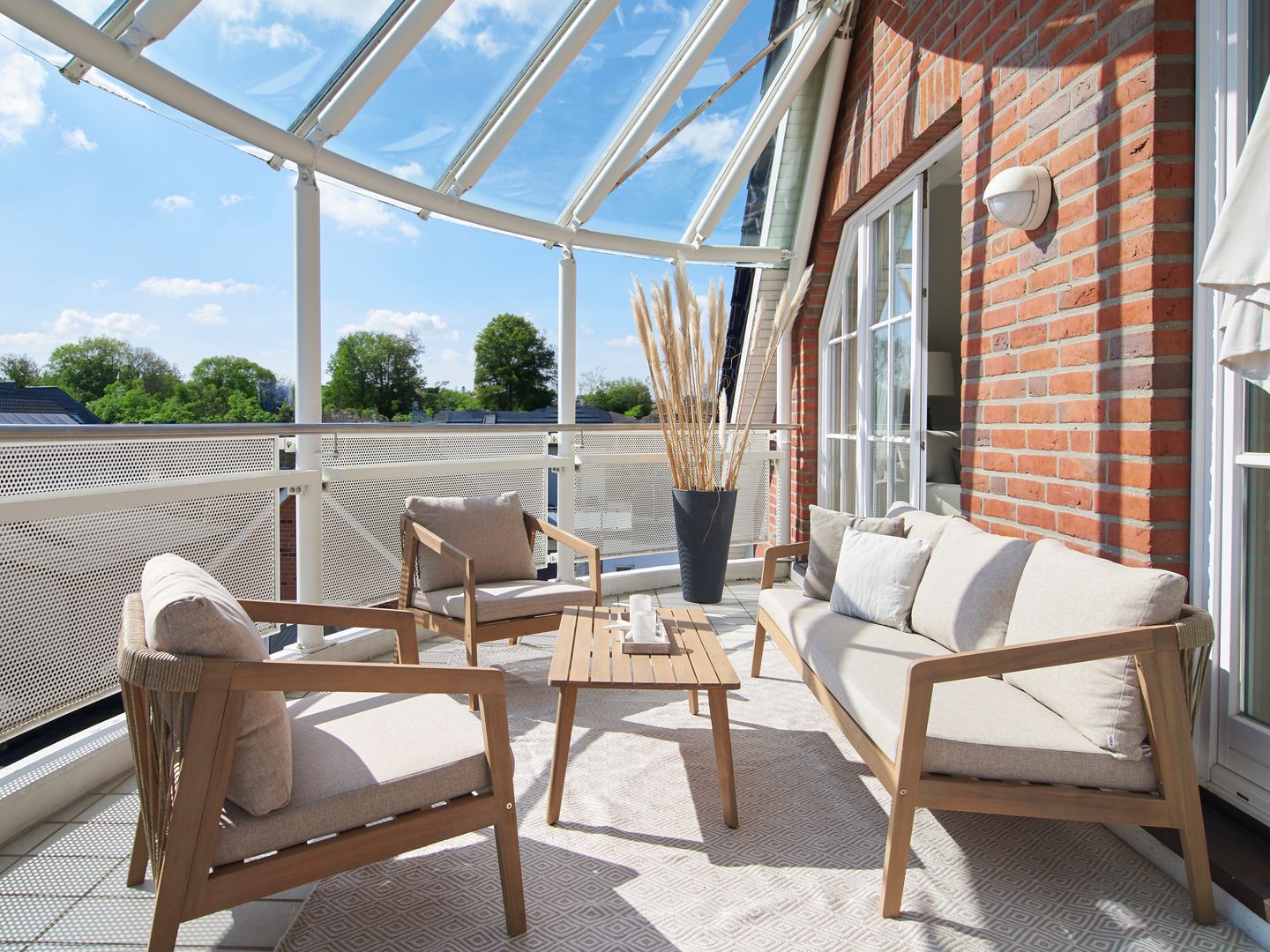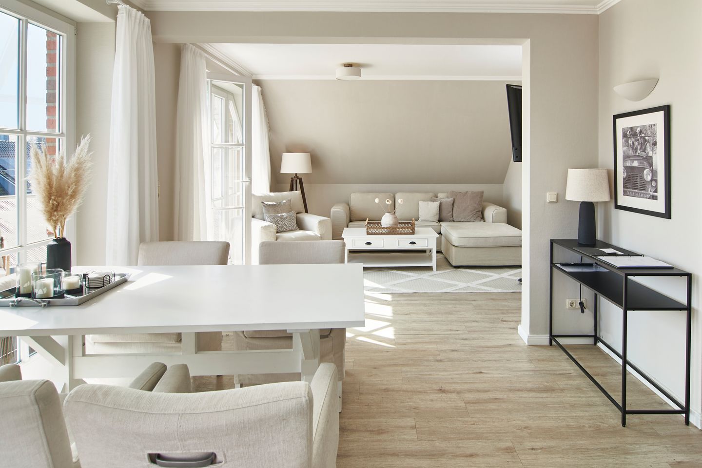 Der untere Bereich bietet einen großzügigen Wohnraum in freundlichen Tönen mit offen gestalteter, modern ausgestatteter Küche und einladendem Essbereich. Das große Sofa, ein gemütlicher Sessel und Smart-TV laden zum Entspannen und Verweilen ein. Vom glasüberdachten Balkon genießen Sie die Vormittagssonne und die frische Meeresluft – ideal für ein entspanntes Frühstück. Eine neu integrierte, stilvolle Lounge schafft hier den passenden Rahmen für besondere Stunden im Freien. Im Frühjahr ergänzt ein Esstisch mit Bänken den Bereich und bietet zusätzlichen Platz für gemeinsame Zeit.