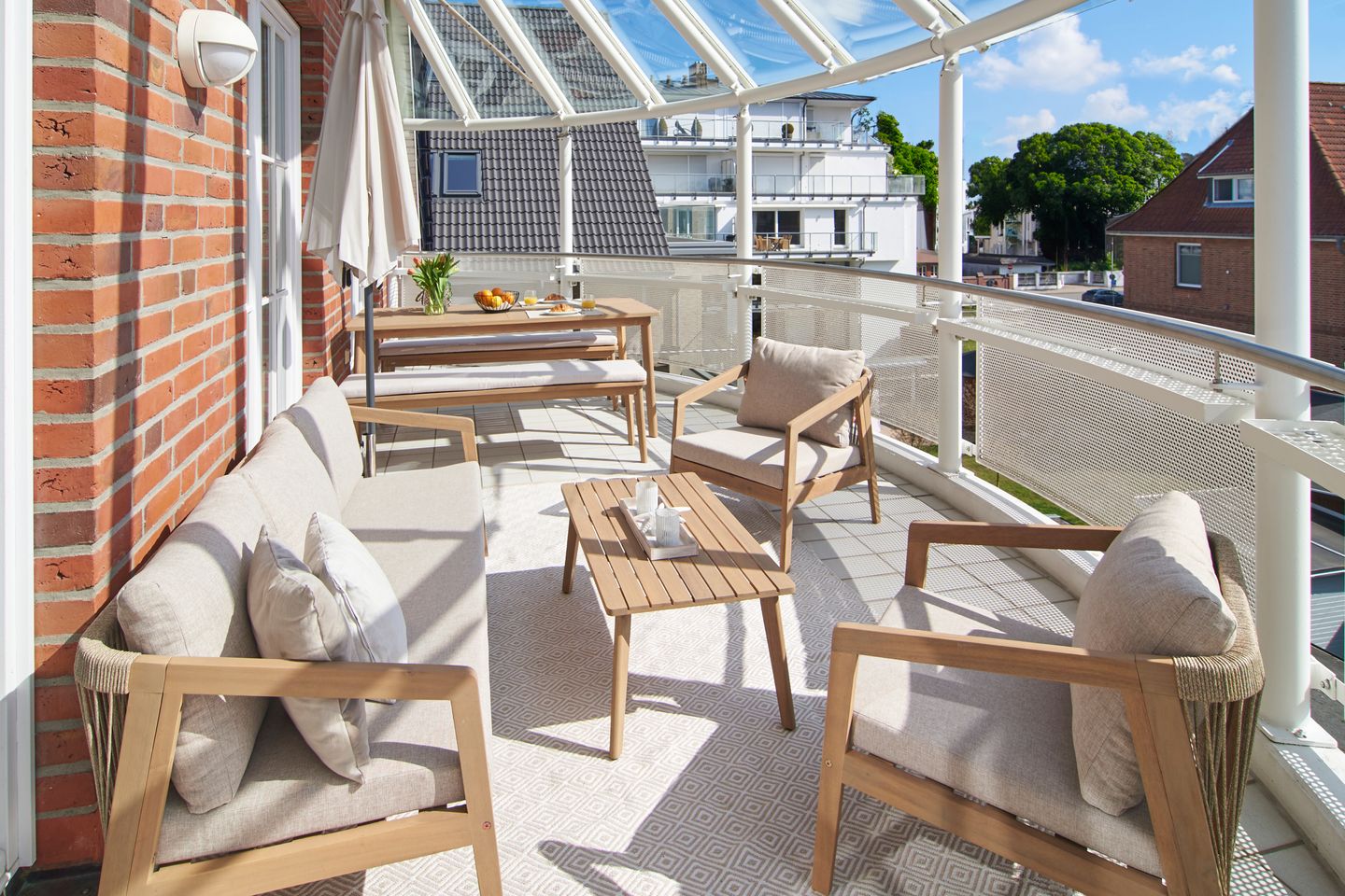 Sehr schön der großer überdachter Balkon. Optmale Lage zum Strand + zum Bummeln.