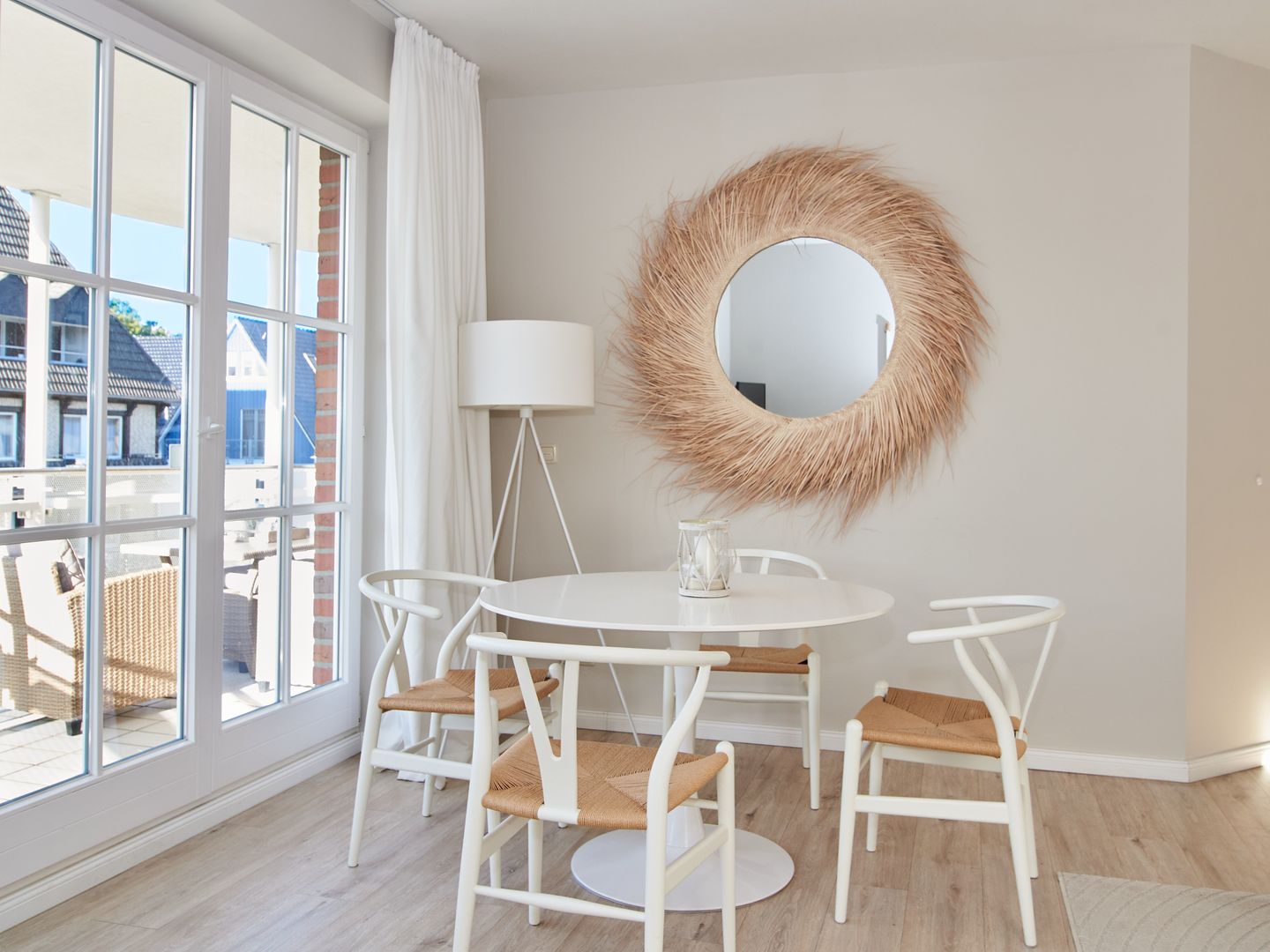 Der Essbereich mit echten Designklassikern unterstreicht den eleganten Stil des Apartments – stilvoll und zeitlos zugleich.