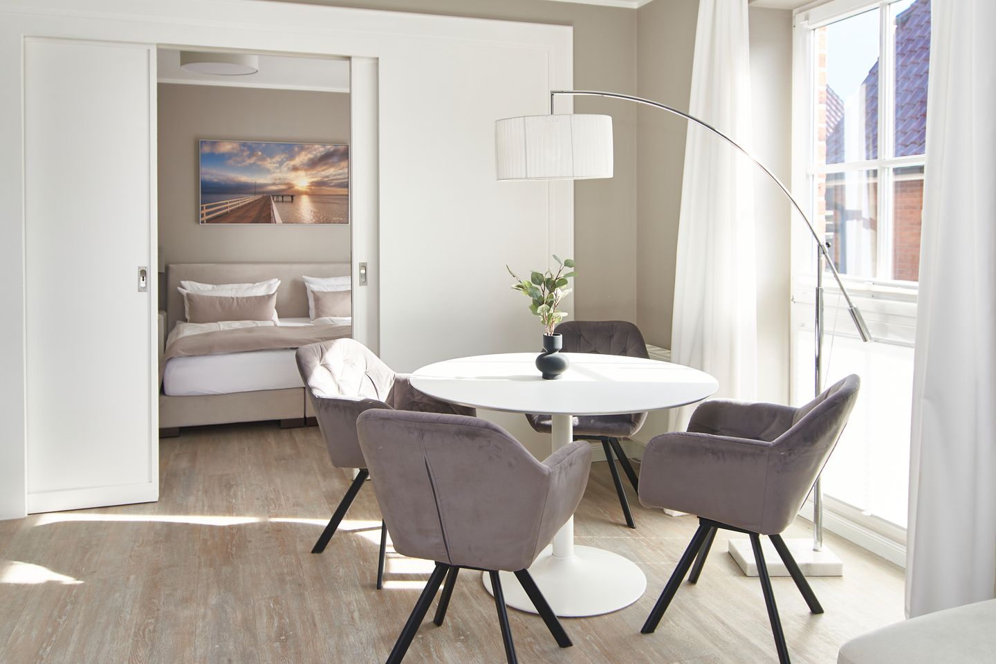 Die beiden Schlafzimmer sind über den Flur erreichbar. Boxspringbetten und verdunkelbare Gardinen sorgen für eine behagliche Atmosphäre und erholsame Nächte. Das Hauptschlafzimmer bietet ein Boxspringbett in Überlänge, einen Smart-TV sowie direkten Zugang zum Balkon und zum Bad. Das zweite Schlafzimmer ist sowohl über den Flur als auch über eine Schiebetür vom Wohnzimmer aus zugänglich und unterstreicht die offene und großzügige Raumwirkung des Apartments.